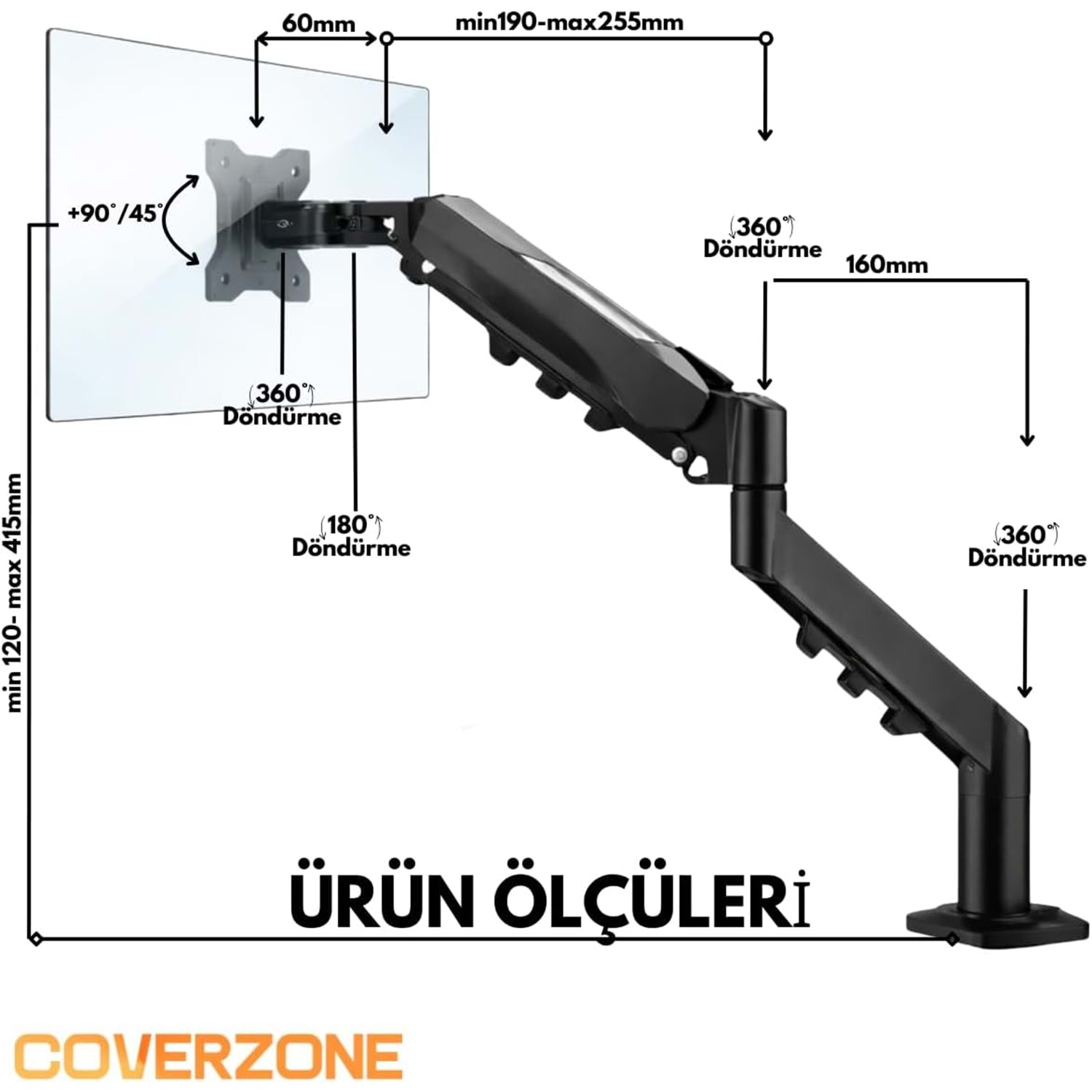 Coverzone F80 modelinin en büyük avantajı, içerisinde barındırdığı pürüzsüz gazlı yay mekanizmasıdır. Geleneksel vidalı veya kademeli monitör kollarının aksine, amortisörlü sistem ekranı sadece tek bir parmak dokunuşuyla yukarı, aşağı, sağa veya sola hareket ettirmenize olanak tanır.